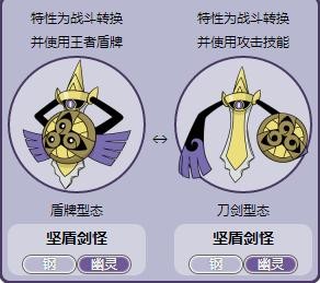 双剑鞘再次进化就是坚盾剑怪了,双剑鞘进化为坚盾剑怪后不再只是剑,同时还装备了盾牌,模式则是依据坚盾剑怪的行动而变化为攻击模式或防御模式,也就是说,坚盾剑怪拥有两种战斗形态,一种是主防御,一种是主攻击的双模式精灵,可以通过变装来进行改变!