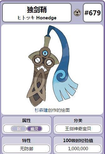 宠物小精灵的世界中,有这样一个家伙,在过去人们使用的长剑时,在被远古魂魄寄宿后诞生的宠物小精灵。独剑鞘,在它剑柄上的蓝布,能像手腕般自由活动。若不小心将手放在剑上,便会被蓝布缠住吸取能量。