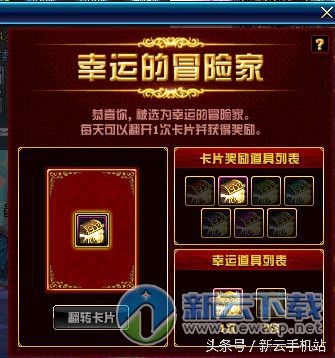今天小编上线突然发现了dnf游戏界面的左上角出现了一个“幸运日”的按钮,点开出现了“幸运的冒险家”活动页面,点击翻转卡片就邮寄我了两个礼盒,奖励很不多哦!那么这个幸运日为什么有些玩家没有呢?要怎么样才会出现这个幸运日按钮?和新云小编一起来看看吧。
