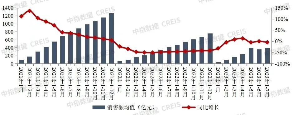 根据机构数据,2023年1—7月全国房地产企业销售业绩排行,销售额保利发展、万科、碧桂园排名前三,中国恒大销售415亿元,排名第23。从数据来看,2023年1-7月,前100房企销售总额为39944.0亿元,同比去年下降4.6%。其中7月单月销售额同比下降34.1%,环比下降33.8%,整体呈下降趋势明显。