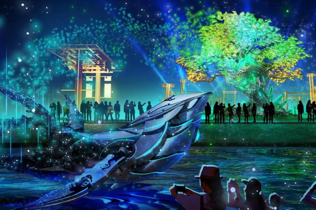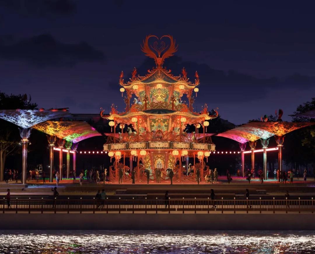 还有12米高的青龙祈福树、朱雀旋转木马、赛博舞狮,目测能吸引不少汉服小姐姐。
