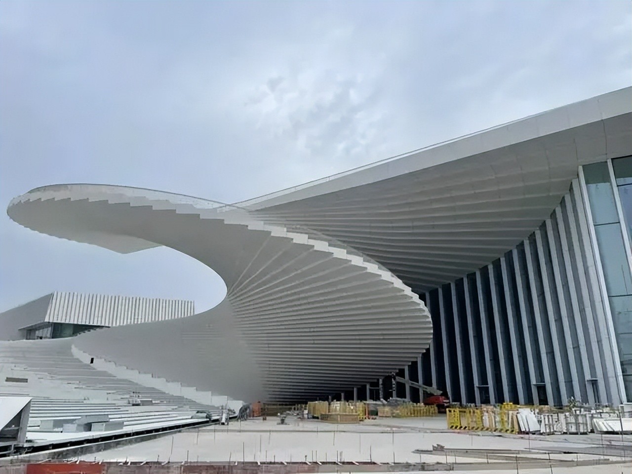从空中俯瞰,剧院就像一把徐徐展开的白色中式折扇,阶梯呈螺旋式上升,延伸至天空。