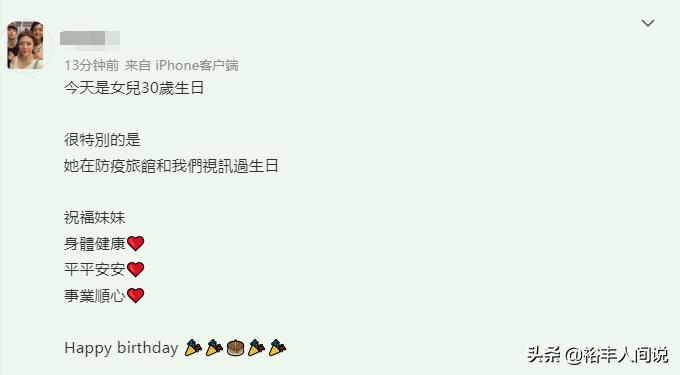 12月28号,沉浸许久的曾哲贞罕有于社交网上为女儿庆生。并留言说道:今天是女儿30岁生日,很特别的是她在防疫旅馆和我们视讯过生日,祝福妹妹,身体健康,平平安安,事业顺心。