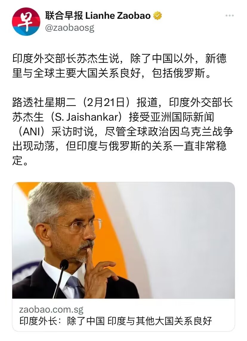 今年2月21日,印度外长苏杰生公开说,除中国外,印度与全球主要大国关系良好。也就是明说了,印度与中国关系不好!
