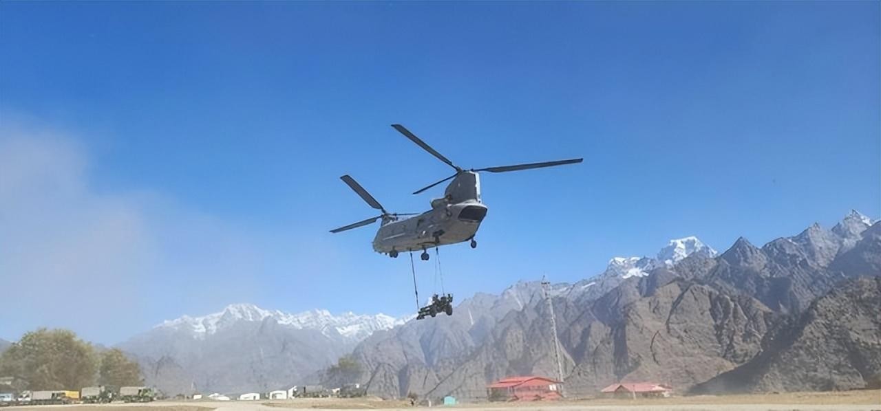 布署在中印边境的CH-47“支奴干”运输直升机和M777型榴弹炮