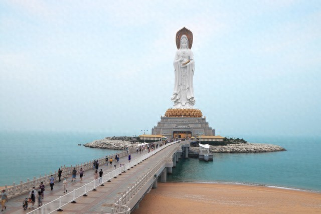 三亚南海观音,有三个世界独创性:一是海上108米高度比灵山大佛高10 米,比美国自由女神高12米;二是三面的白衣观音形象;三 是海上圆通宝殿面积达1. 5万平方米。观音像主体由金属钢架和外部优质不锈钢板组成。体重约2500吨,工期6年,耗资8亿元,海上观音成为当代雕塑之最。因为从不同方位看这座观音像是不一样的姿势的,这座观音像一面是手持莲花,另一面是手持经书,还有一面是手持佛珠。观音雕塑它底下的莲花宝座高约十米,大约有四层,一共有108个莲花瓣,据说是用黄金打造而成的,凭借着这个南山海上观音,如今的三亚南山也成为世界级礼佛圣地,每年都会有很多佛教信徒前来这里参观。