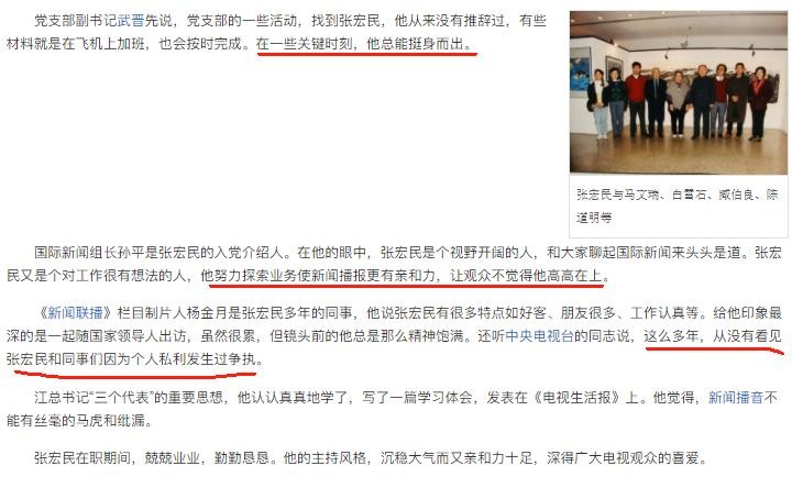 还有《新闻联播》的栏目制片人杨金月也说,张宏民永远不会为私人利益跟人发生争执,在镜头前,他也永远都是那么精神饱满。