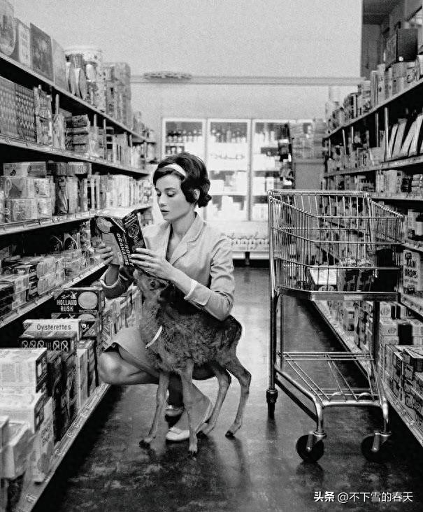 26. 1958 年,奥黛丽·赫本 (Audrey Hepburn) 带着她的宠物鹿在加利福尼亚州比佛利山庄购物。