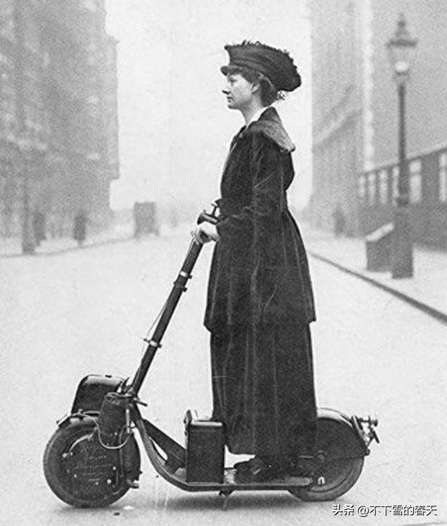 1. 1916 年,一位衣着时尚的女士骑着一辆早期的摩托车沿着道路行驶。