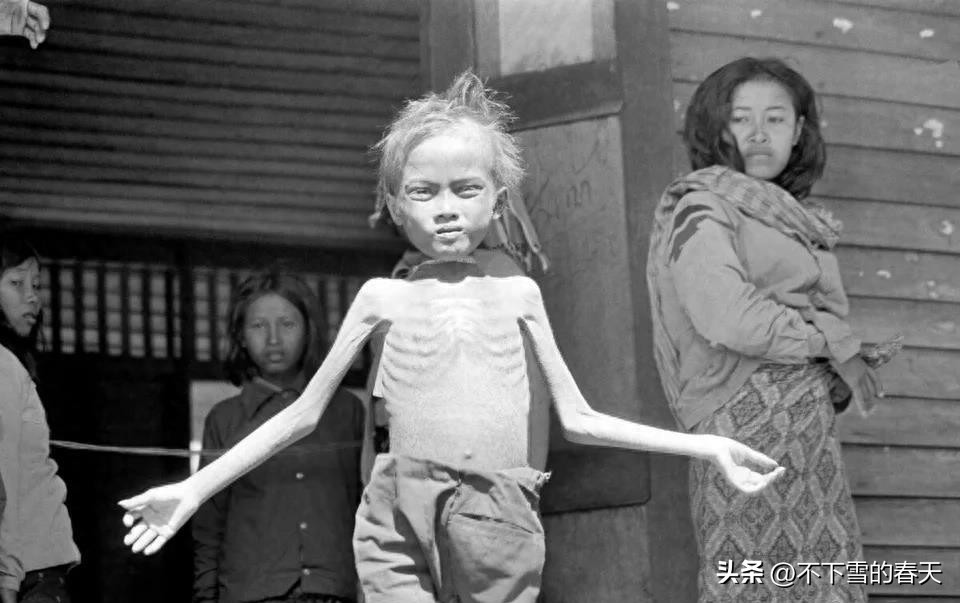 32. 1979 年,泰国难民营中,一名柬埔寨儿童展示自己饱受饥饿、疾病和战争蹂躏的身体。