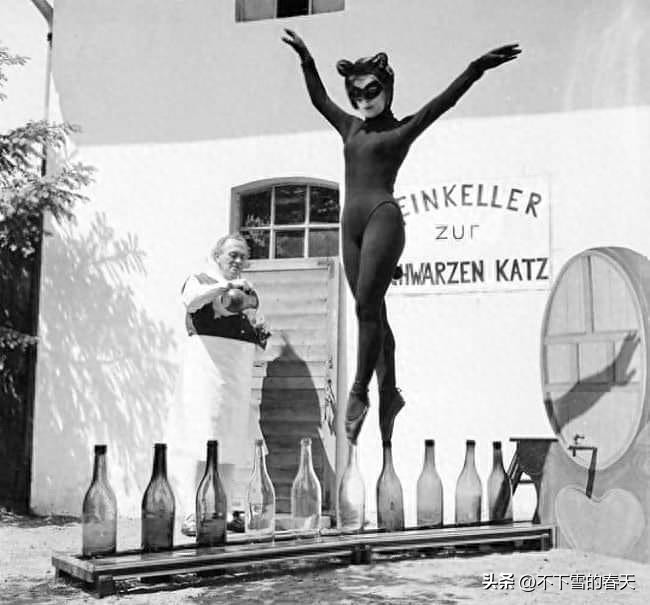 1958 年,汉堡,20.17 岁的比安卡·普萨基 (Bianca Psaki) 身着猫装在酒瓶上跳舞。