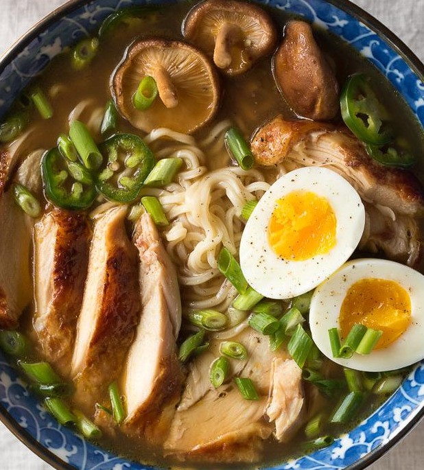 煮鸡肉:将烤箱预热至375度。黄油融化后抹到预先用盐和黑胡椒粉腌制过的鸡肉上,拿到煎锅上两面各煎5至7分钟,使表面变成金黄色。将煎锅移到烤箱中烤15至20分钟,直到鸡肉煮熟。从烤箱中取出鸡肉并用箔纸覆盖保温备用;制作拉面汤头:在锅中用中火加热油,放入大蒜、姜、酱油、料酒,再加入蘑菇慢火煮10分钟,最后用盐调味待用;煮鸡蛋:清水慢火煮鸡蛋,7-8分钟即可。鸡蛋煮好后剥壳切成两半备用;煮面:将面煮熟,面条的软硬口感可按自己的喜好,用控制煮面的时间来达到。日本拉面以清爽偏硬的质地著称,想要达到这个效果,煮好的面可以用干净的冷水过一遍,再沥干后盛入碗中,然后将煮沸的汤头倒入碗里。把切好的鸡蛋和鸡肉搁到拉面上,最后撒上新鲜的葱花、芝麻和胡椒,这碗拉面就算大功告成啦!