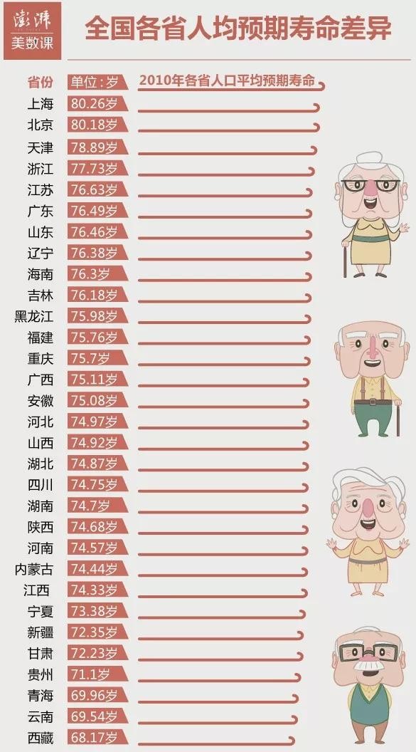 这个排名不用仔细统计,就能发现,与经济发展相符合。三个老牌直辖市排在前三,然后是浙江、江苏、广东、山东、辽宁,都是“富可敌国”的经济大省。比较让人意外的是吉林和黑龙江排在第十、第十一位,好像与其经济发展的地位差距很远,但要考虑到在建国初期到改革开放期间,东北经济在全国那是响当当的,也就不难理解了,毕竟人均寿命是长期原因导致的。
