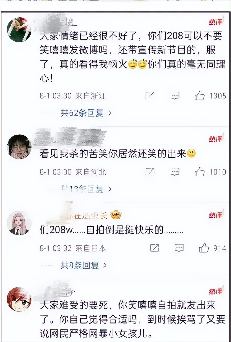 说到底,花少团来看奥运,跟节目组脱不了干系。网友们自然也把矛头对准了节目组。"节目组是不是脑子有坑?奥运会是你们炒作的地方吗?""拿运动员的遗憾当节目素材,良心不会痛吗?""别拿奥运会当儿戏好吗?尊重一下运动员行不行?"可以说,这次事件不仅让明星们深陷舆论漩涡,连带着节目组也被骂得狗血淋头。