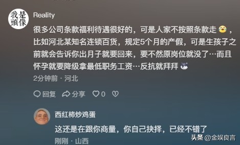 她认为:“很多公司条款福利待遇很好的,可是人家不按照条款走,比如河北某知名连锁百货,规定5个月的产假,可是生孩子之前就会告诉你出月子就要回来,要不然原岗位就没了,而且怀孕就要降级拿最低职务工资。”