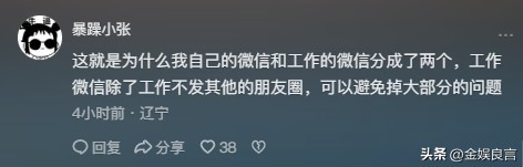 还有网友开玩笑的表示:“这就是为什么我自己的微信和工作的微信分成了两个,工作微信除了工作不发其他的朋友圈,可以避免掉大部分的问题。”