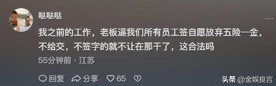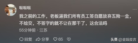 她表示:“我之前的工作,老板逼我们所有员工签自愿放弃五险一金,不给交,不签字的就不让在那干了,这合法吗?”