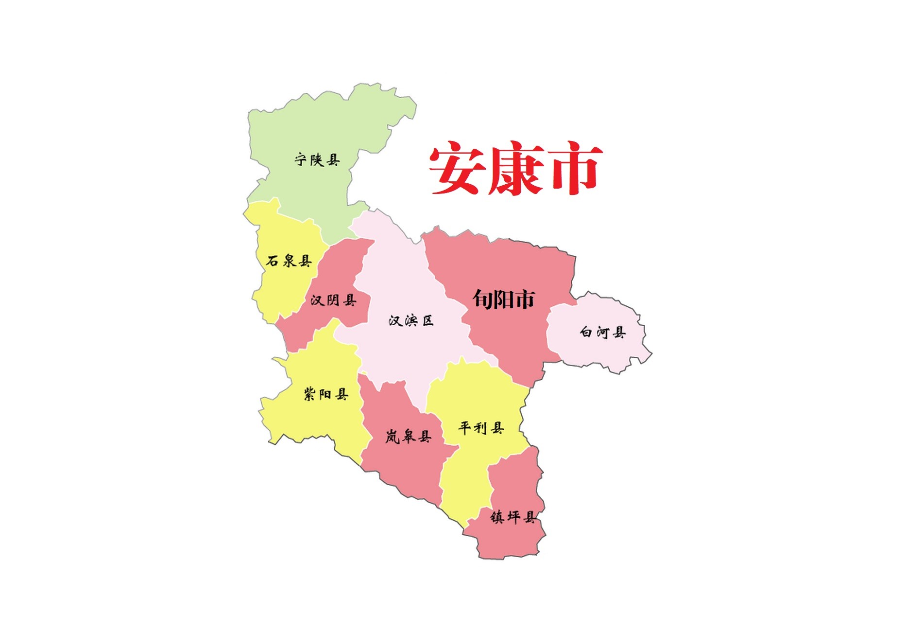 安康市,市政府驻汉滨区。位于陕西省东南部,东、东南毗邻湖北省十堰市,南接重庆市、四川省达州市,西、西北与汉中市相连,北与西安市接壤,东北与商洛市毗连。