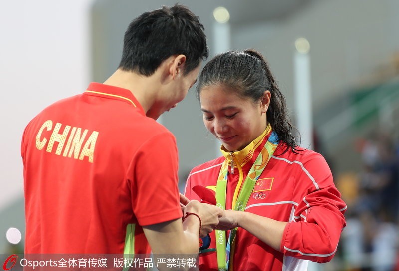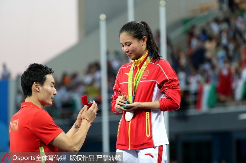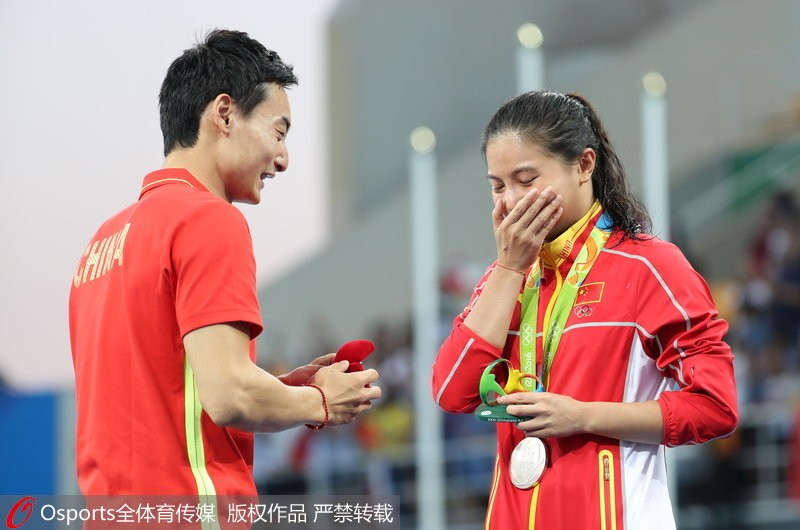 人民网8月15日电 北京时间8月15日,在2016年里约奥运会跳水女子三米板决赛中,中国选手何姿夺得银牌。颁奖仪式结束后,与何姿相恋 六年的中国跳水队名将秦凯现身,单膝跪地向何姿求婚,何姿当场落泪,欣然接受。2012年伦敦奥运会,秦凯错失金牌现场落泪,何姿在场外送上拥抱安慰,两人的恋情随即公开。(/Osports全体育传媒 版权作品 严禁转载)