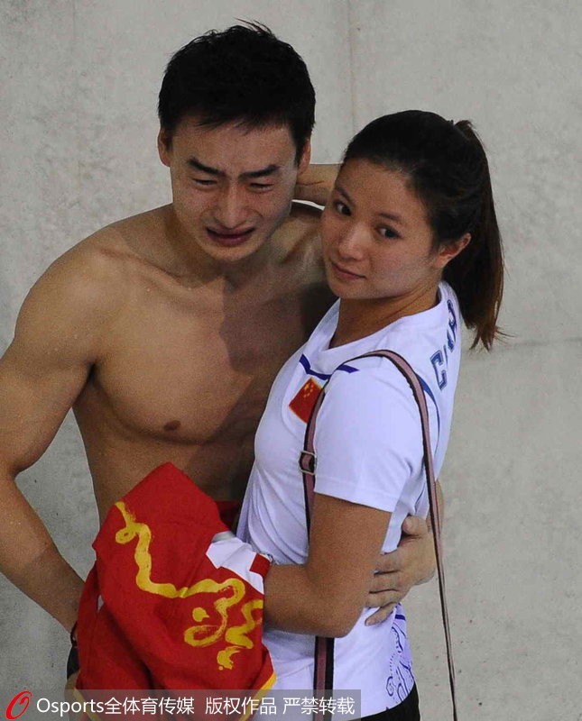2012年伦敦奥运会,秦凯与金牌失之交臂当场落泪,何姿送上拥抱安慰男友。