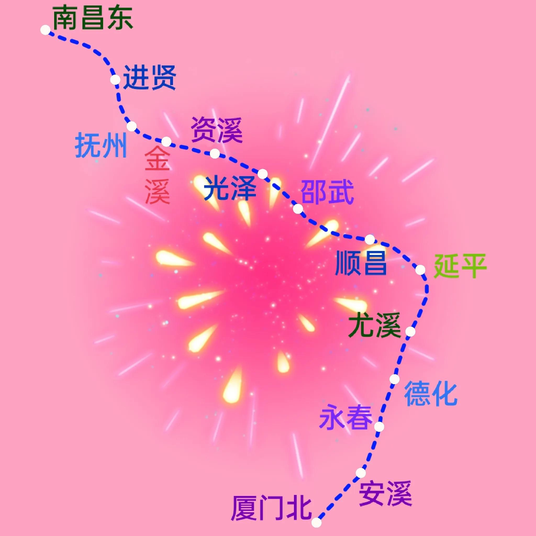 根据初期规划,这条线路会从江西省的南昌铁路枢纽开始,由在建设中的南昌东站接出,途经进贤县、到抚州站、金溪县、资溪县后,到达福建省的光泽县、邵武市,在经顺昌县、延平区、三明市尤溪县、泉州市德化县、永春县、安溪县后,直至集美区后,终于厦门北站止,全线拟设十四座站点。目前,线路走向和途经位置是根据初期阶段已知信息综合整理而成,仅供求知者参考作用。具体线路走向和站点位置以官方公布为准!
