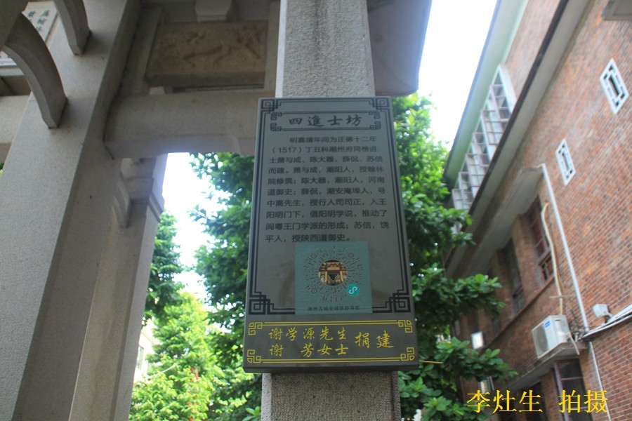 位于四进士亭巷口。屹立在大街四进士亭巷口的四进士坊,上坊镌上"为翰林院修撰萧与成.陕西道御史苏信。河南道御史陈大器,行人司正薛侃立。"左镌"潮州知府丘其仁.通判黄洪.范惟恭,推官秦撰建"。