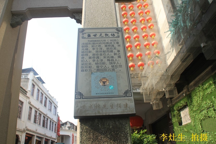 "盛世元凯坊"又称"戊辰八贤坊",是"为崇祯戊辰进士同榜八人辜朝荐、郭之奇、黄奇遇、宋兆禴、李士淳、梁应龙、杨任斯、陈所献建"崇祯戊辰为明崇祯元年(1628年)。他们就是被潮人尊称的"后八贤"。