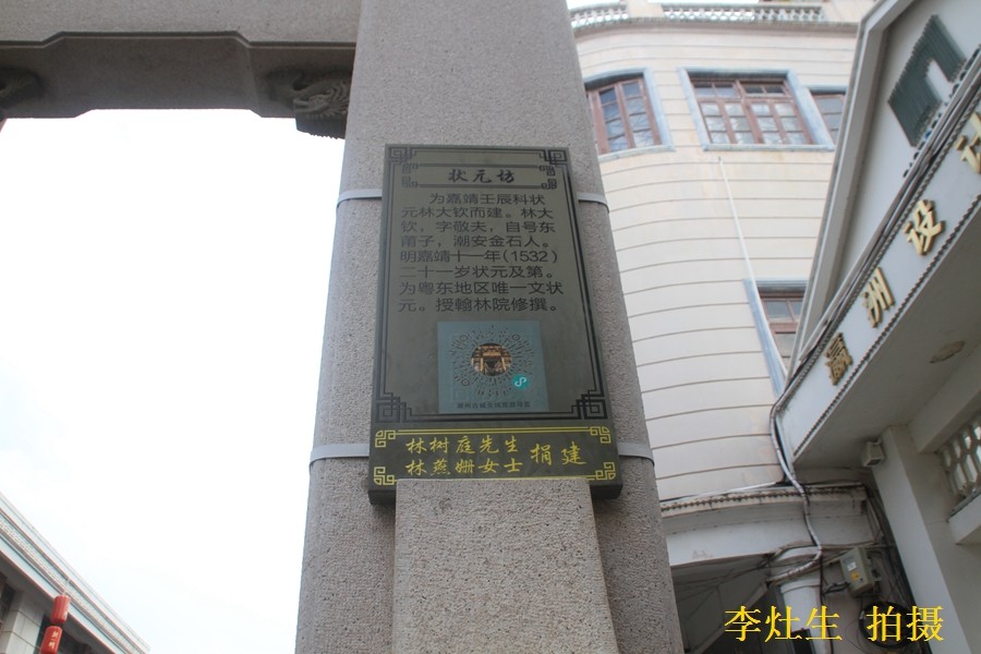 "状元坊"与其它坊相比,在外观上有很大的区别--它的第一层承载全亭上部的坊梁是整条的,有"国家栋梁"的象征,而其它牌坊则不是整条横石。"状元坊"是为明嘉靖壬辰科状元林大钦建。