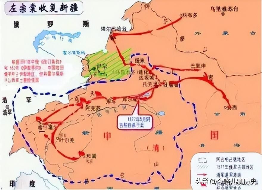 1862年-1878年间左宗棠先后平定陕甘回民大起义,平定新疆回民起义,并收回伊犁。
