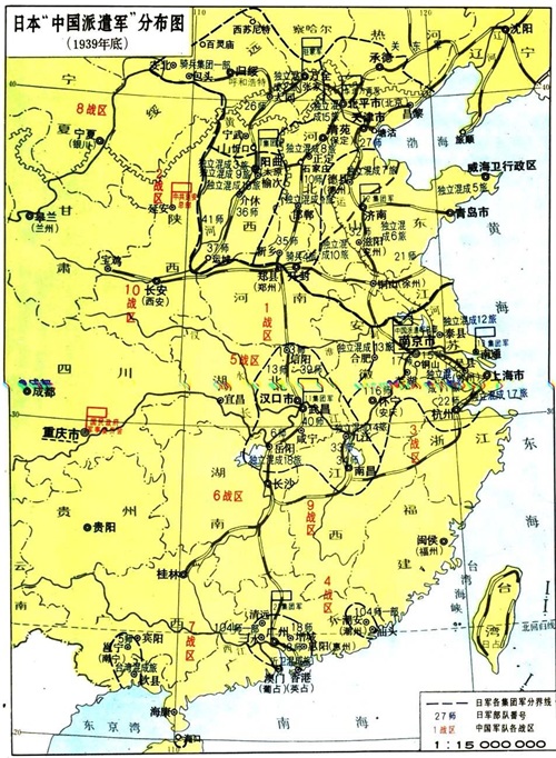 1938年10月武汉会战时,日军侵华兵力(不含驻伪满兵力,下同)为24个师团、4个独立混成旅、1个骑兵集团(2个旅)、1个支队。其中华中派遣军13个师团、1个支队,华南21军3个师团,华北方面军8个师团、4个独立混成旅和1个骑兵集团。到1939年底侵华日军基本完成了巩固侵略成果的新部署,此时其兵力变化主要是独立混成旅增加到20个,这些军队分成了四大战略集团:华北方面军再次成了它最大战略集团,辖9个师团、12个独立混成旅和1个骑兵集团,其主要任务就是与后方抗日力量打一场“华北治安战”;其第二大战略集团就是部署在华中武汉地区的11军,辖7个师团、2个独立混成旅,其任务依然是与正面国军作战,以攻势防御保守占领区并从军事上配合其以“文”侵华行动,当然伴随着后方抗日游击力量的出现,也出现了“治安战”的成分;其第三大战略集团就是13军,它部署在以京沪杭为重心的华东地区,辖4个师团和4个独立混成旅,其越来越重要的任务也是巩固侵略成果的“治安战”;其最后一个侵略集团就是华南21军,辖4个师团和2个独立混成旅,主要任务是切断中国的对外输送通道,同华中占领区一样,“治安战”成分也慢慢出现了。上述兵力再加上侵华海空等部,合计85万人。另外,1939年9月,日军大本营正式成立了中国派遣军总司令部,统辖侵华一切军事和政治力量,特别是促进以“文”侵华工作,正如《中国事变陆军作战史》所言,“适应将要诞生的汪兆铭新政权,特别是为了促进对重庆的工作”,这个派遣军司令部的成立是“文”的意义大于武的意义。
