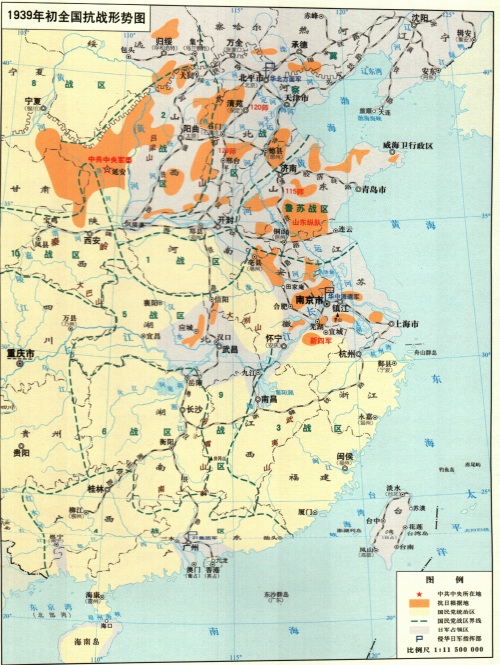 介绍了飞机加大炮的欧洲战场,下面我们要把视线全面转向小米加步枪的东方抗日战场了。1939年到来时,这个战场的根本性变化就是单纯的战略防御阶段结束了,而迎来了关键性的战略相持阶段,这是有利于我不利于敌的变化,这是中国人民全面抗战一年多来坚决与侵略者抗争取得的最重大战果。关于战略相持阶段,以毛泽东为代表的中国共产党人已经作出规划,已经明确了未来发展的路径,这是一条前所未有的道路,这是一条完全适合中国人民抗日实际的道路,因其“完全适合”才是“前所未有”。那么战略相持阶段究竟是一个什么样的阶段?这是一个前途是光明的而道路依然曲折的阶段,这是一个艰苦卓绝的阶段,这是一个敌人实力相对不足,被迫转入战略保守,残酷压榨占领区的阶段,这是一个共产党领导人民群众可以大有作为,与敌人做最艰苦长期斗争,改变敌我实力对比并最终赢得胜利的关键性阶段。中国抗战正面战场作用下降,而敌后战场作用上升,这是战略相持阶段的关键性特征,艰苦卓绝的敌后战场将逐步承担起抗战之重任,成为抗战之重心,而我们正面战场压力相对减轻了,最艰苦阶段过去了,于是国民党及其军队开始想着干别的事情了。