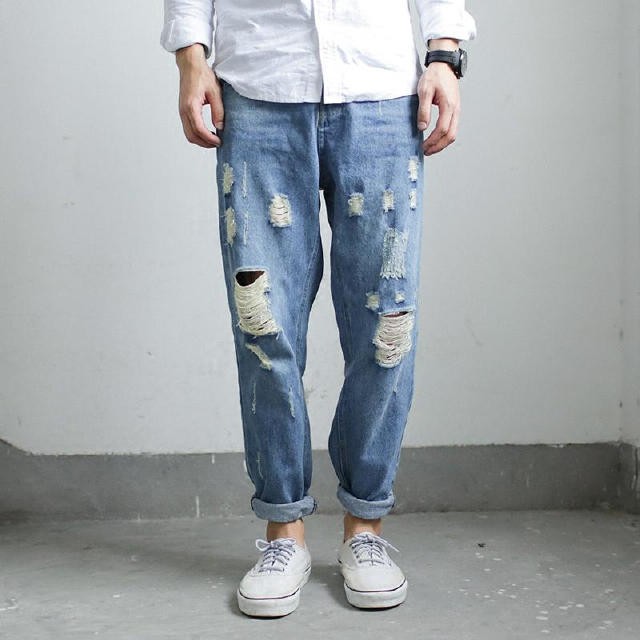 日系衣服裤子总是带着挡也挡不住的清新感,即使是破洞的牛仔裤也一样,但大小不一的破洞也在清新中让你穿着彰显一丝不羁的气质。