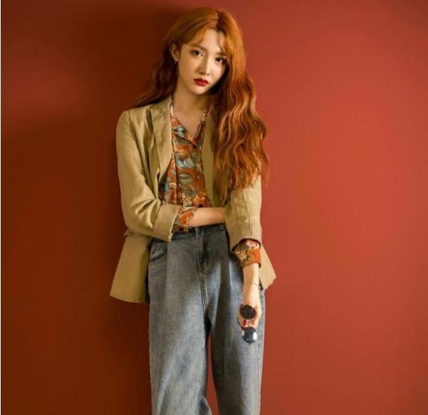 在这一张图片中,艾比选择了比较时尚的颜色-焦糖色。这个颜色给人的第一印象就是非常温柔,而且也有一种日薄西山的美感。艾比的大波浪发型搭配着时髦的穿搭,看起来真的很有范。而且衬衫的外翻领口设计,让艾比看起来更加有气质。当然了如果有学生党喜欢艾比,不妨也模仿一下她的穿搭风格。