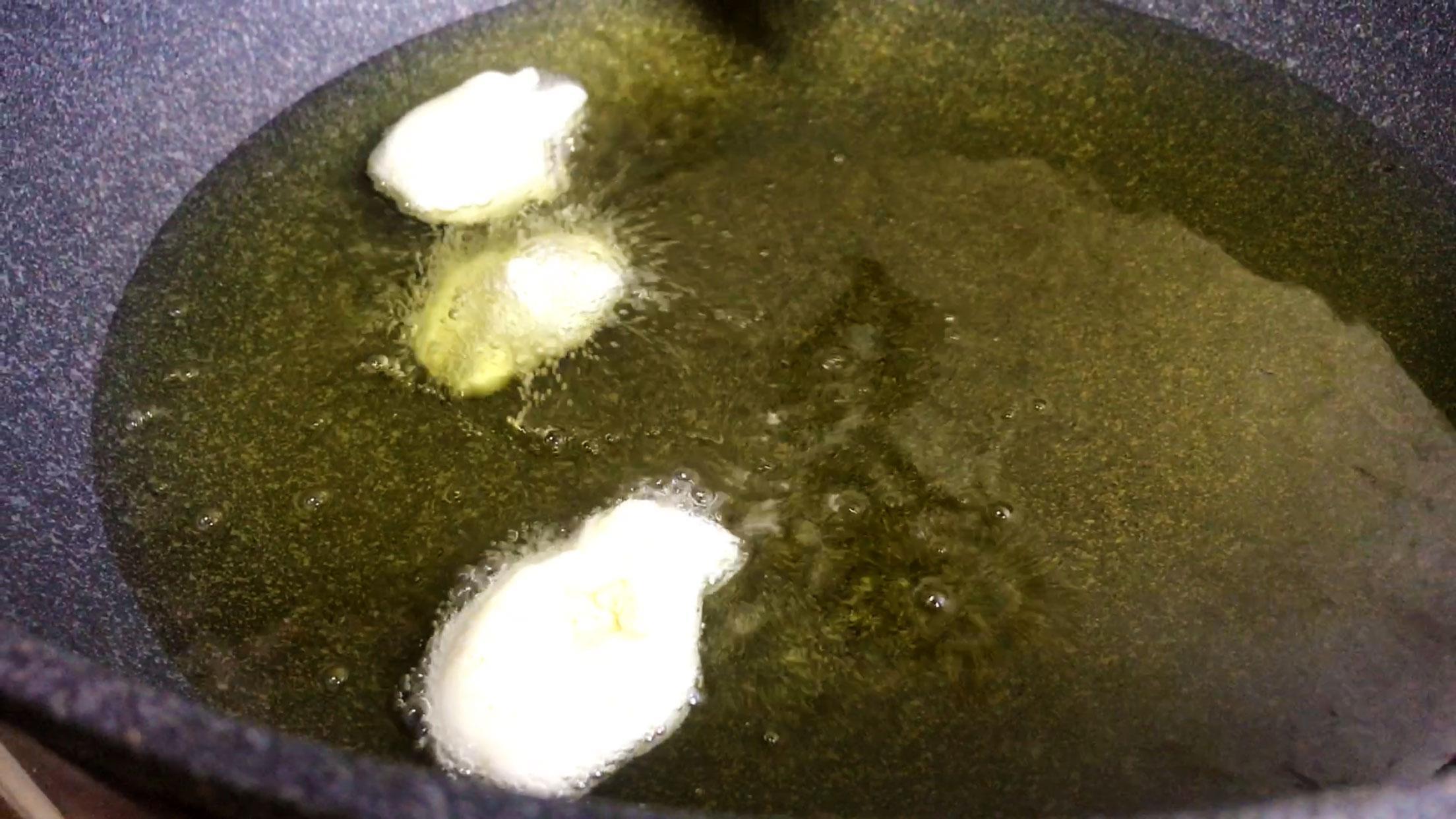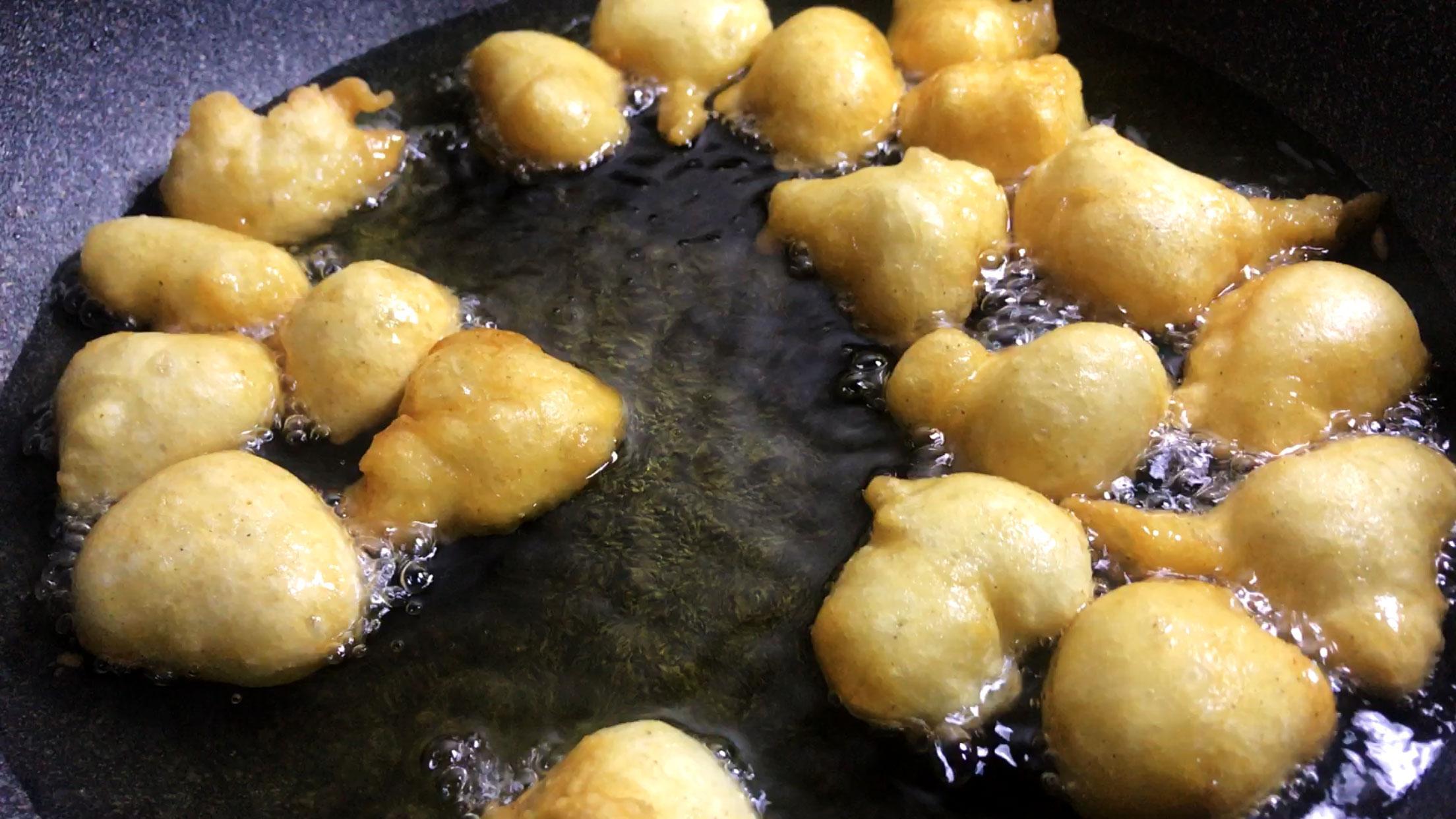 7.用勺子舀出适量的面糊放入锅中,全程中小火炸制