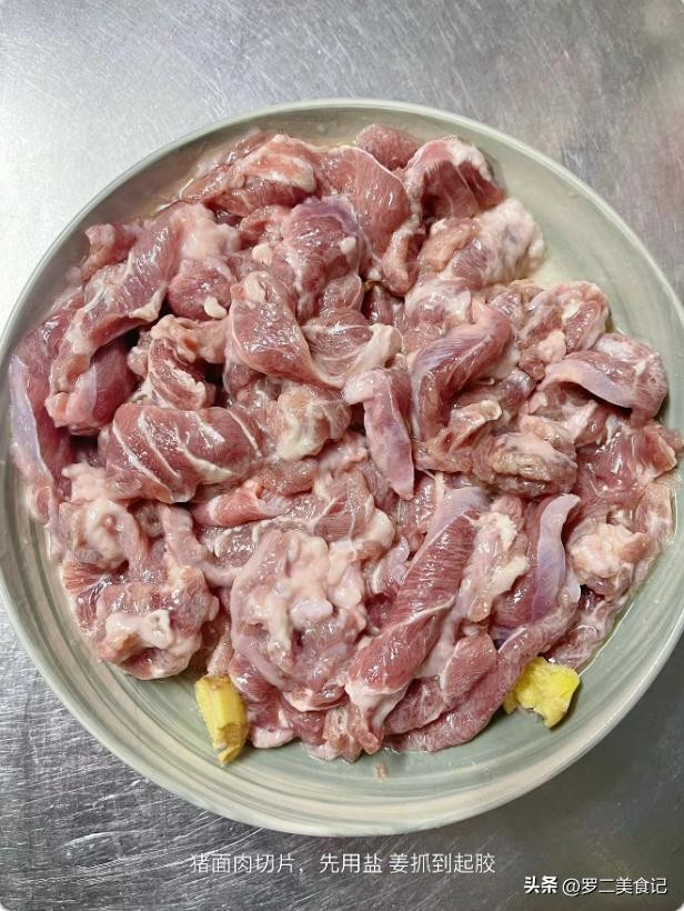 材料:适量猪脸肉,盐,生姜,白糖,玉米淀粉,蚝油,叉烧酱。