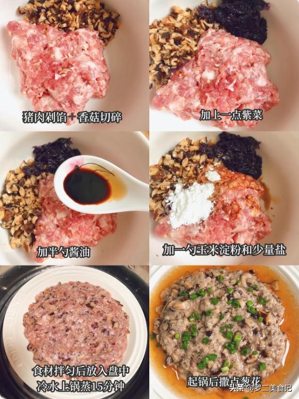 材料:猪肉,香菇,一点紫菜,半勺酱油,1勺玉米淀粉,盐,葱花。
