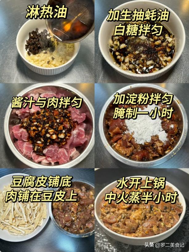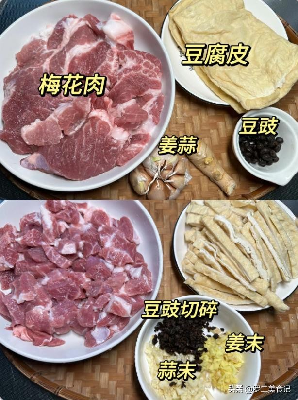 材料:适量梅花肉,适量豆腐皮,姜蒜,豆豉,淀粉,热油,生抽,蚝油。