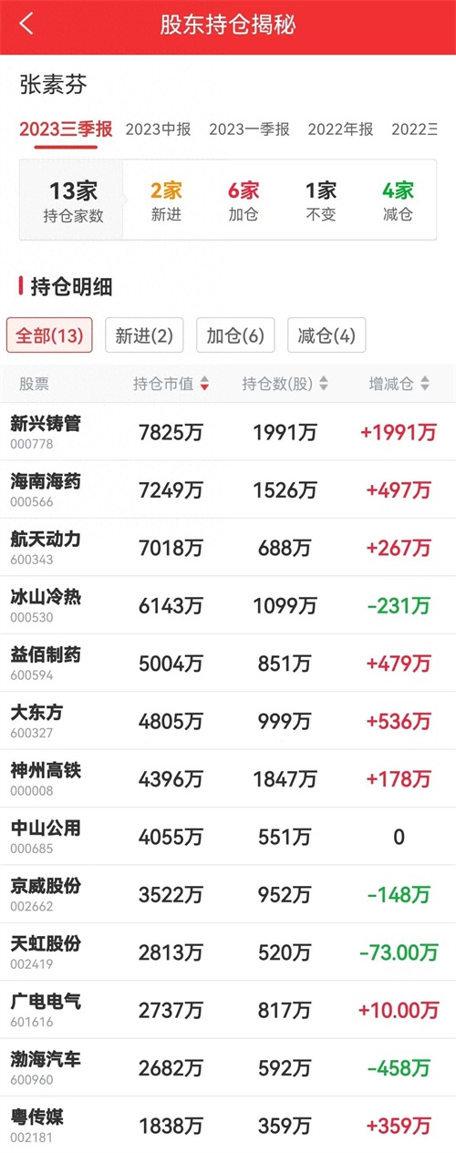 首先是张素芬,在三季度,张素芬一共出现在了13家上市公司的前十大股东中,如下图所示: