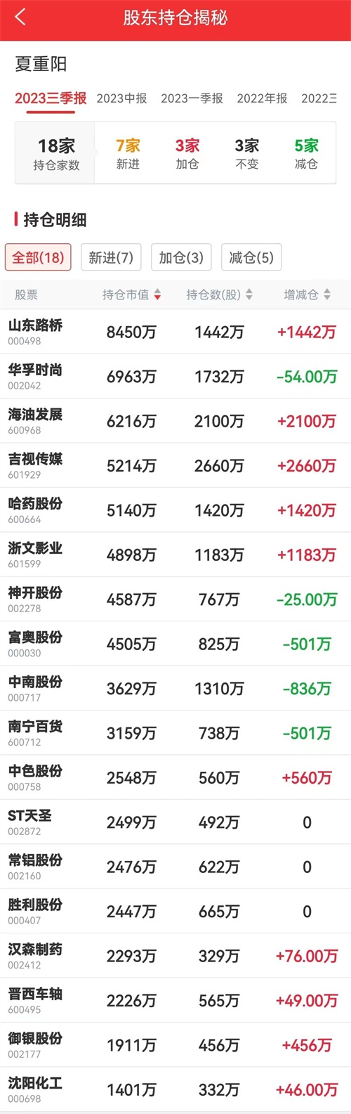 再来看一下夏重阳的持仓,三季度夏重阳一共出现在了18家上市公司的前十大股东中,如下图所示: