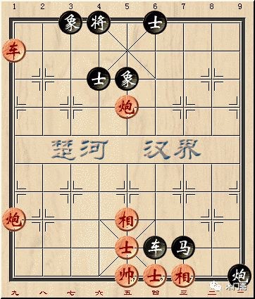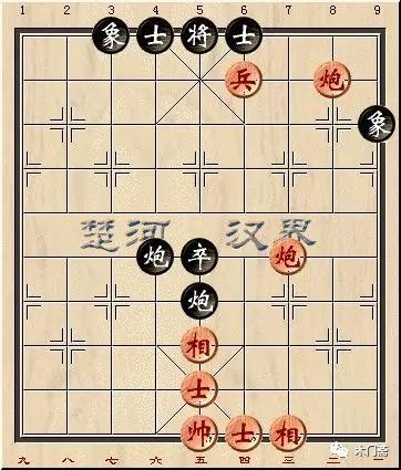 如上图所示,红方走炮二平五即可形成中线重炮绝杀,小朋友切不可走炮二退三吃炮错失胜利。