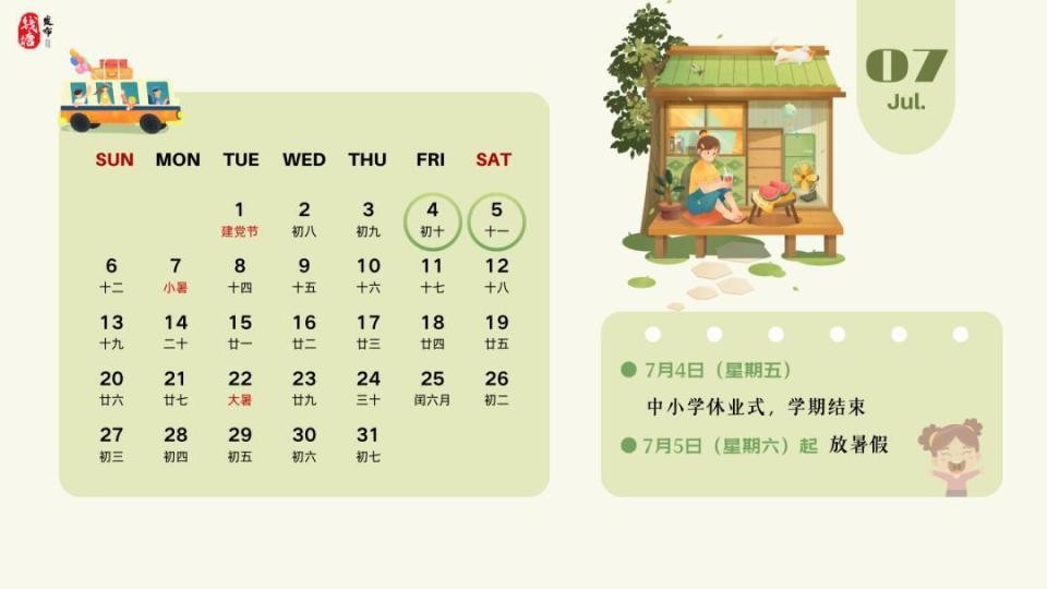 7月4日休业式,7月5日起放暑假。