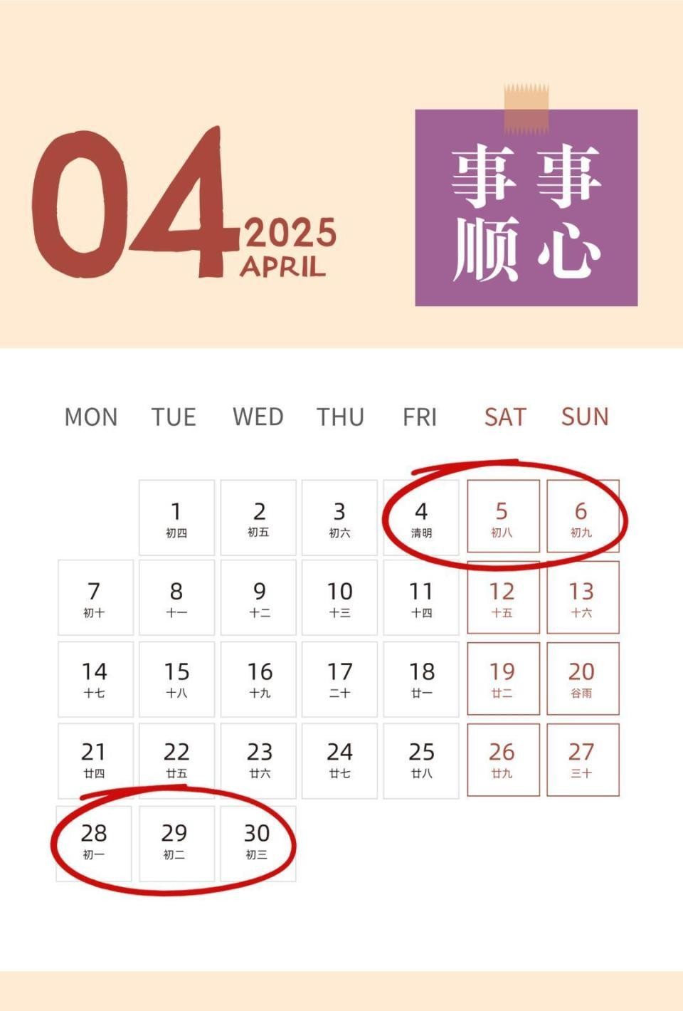 4月4日—6日,清明节放假,共3天。