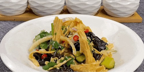装盘的那一刻,真的特别有成就感。金黄的腐竹,翠绿的黄瓜,配上点缀的红辣椒圈,看着就让人胃口大开。