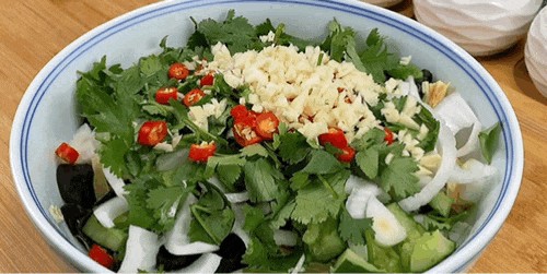 把黄瓜、洋葱、香菜、小米辣和蒜末都加进去,然后开始调味。