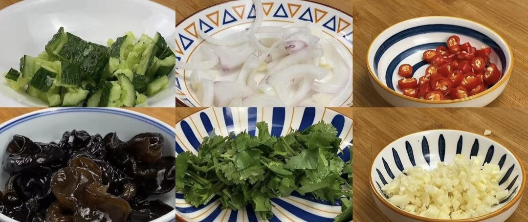 这时候,你可以准备点配菜。我喜欢加黄瓜、黑木耳、洋葱、香菜,再搭配点小米辣和蒜末,既好看又提味。黄瓜要拍一拍再切块,这样更容易入味;黑木耳撕成小块,洋葱切细丝,香菜切段,小米辣切成圈。准备这些配菜的时候,腐竹也泡得差不多了。