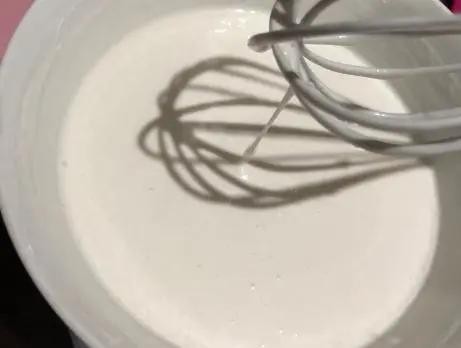 第二步,然后将水分次少许加入在其中,注意要缓缓加入,每一次加入水都需要待其充分吸收才可再次加水,粘米粉和水按照1:1的比例,待将水全部加入在粘米粉中,并且搅拌成顺滑且无颗粒状的稀面糊;