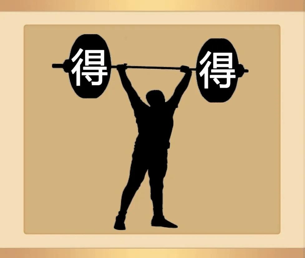 一个人在举重,杠铃的左右两边分别有一个“得”字。