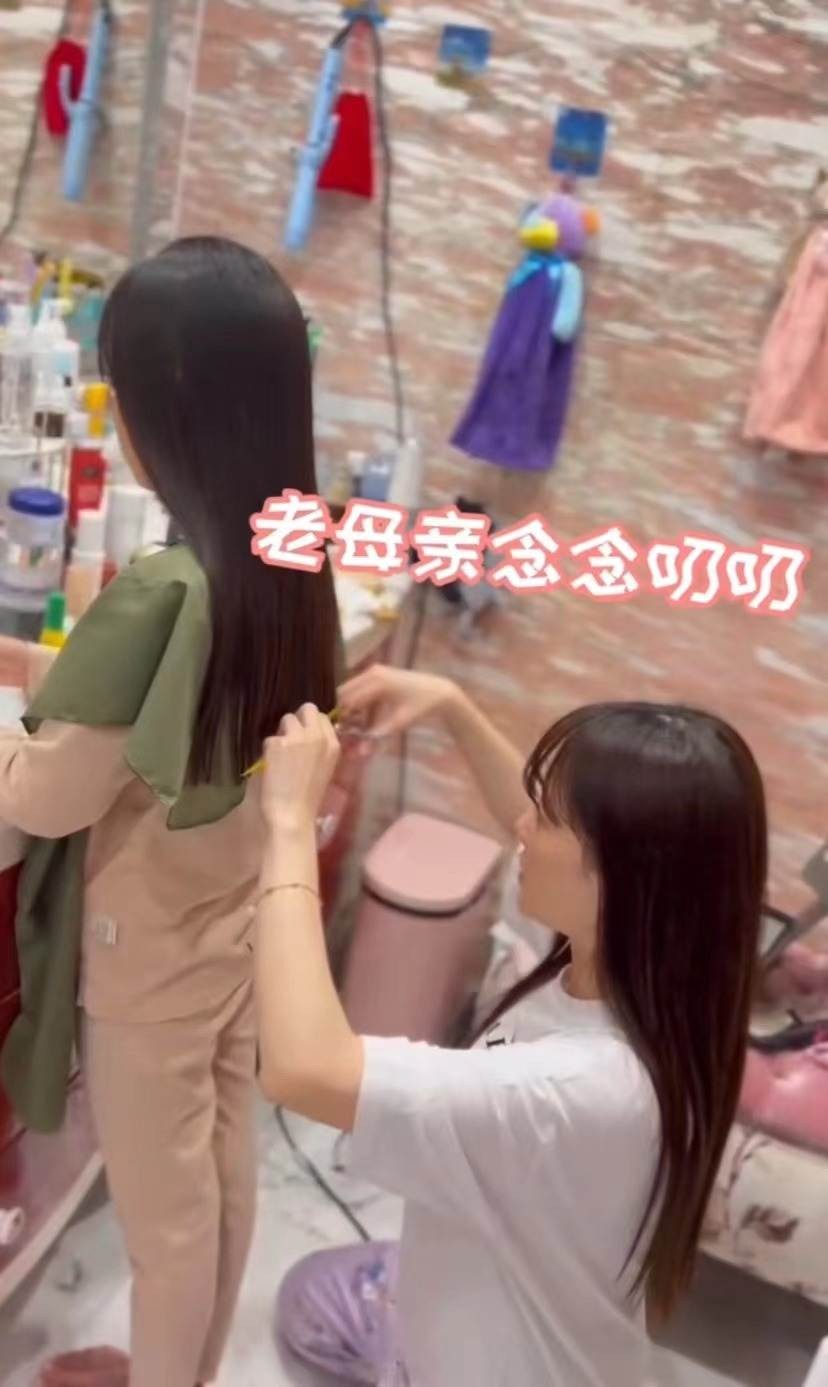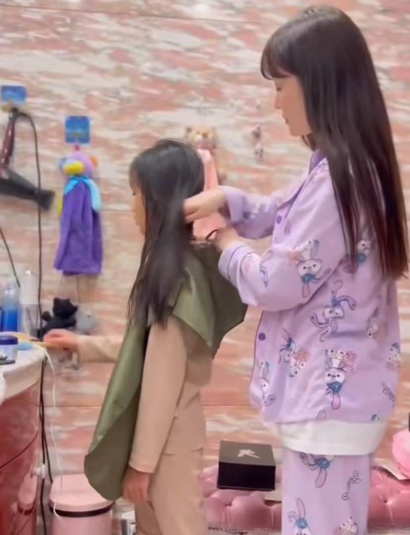 母女俩一前一后站在梳妆镜前,李小璐先是给甜馨戴上理发专用的罩衣,装备很是齐全。紧接着她一只手握住梳子,一只手拿着剪刀,小心替甜馨修剪发梢。剪完后头发末梢齐整,效果非常好,可以看出李小璐平时没有少做这样的事。