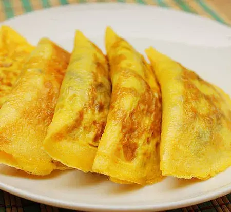 3、如果蛋皮完全凝固了,可以放好肉馅后,在周边抹一圈蛋液,快速对折,轻轻按压,一样可以成型。