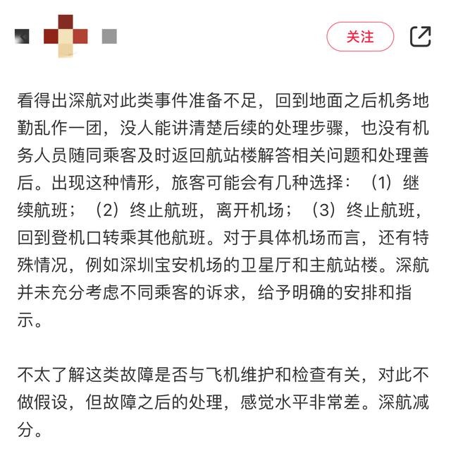 该名网友称,深航ZH9105航班起飞20分钟后“因增压系统故障返航”,并称回到地面之后,没人能讲清楚后续的处理步骤,也没有机务人员随同乘客及时返回航站楼解答相关问题和处理善后。
